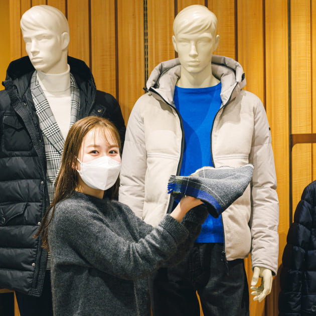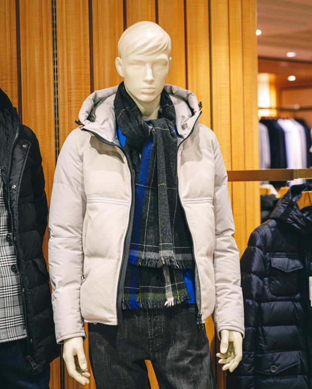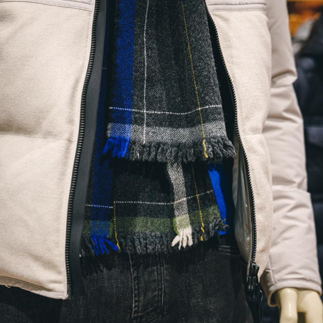 ということで巻いてみました。オフホワイトのダウンにチャコールグレーベースのマフラー。非常に大人っぽいコーディネートです。