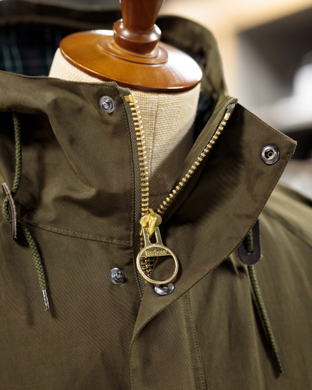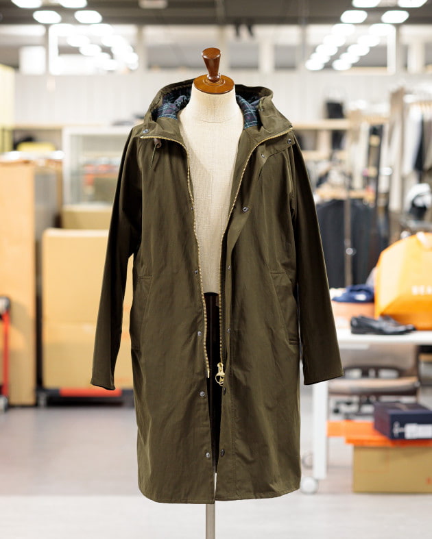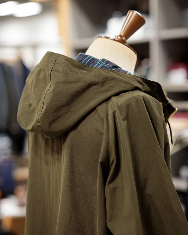 フード一体型のフーデッドコート。英国のアウトドアメーカーのコートをベースに<Barbour>らしいエッセンスを加えてアップデートした一着です。