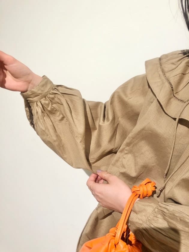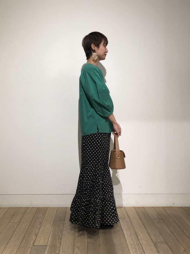 全体的にふんわりとボリュームのあるブラウスで身体のラインを拾わない嬉しいデザイン。
