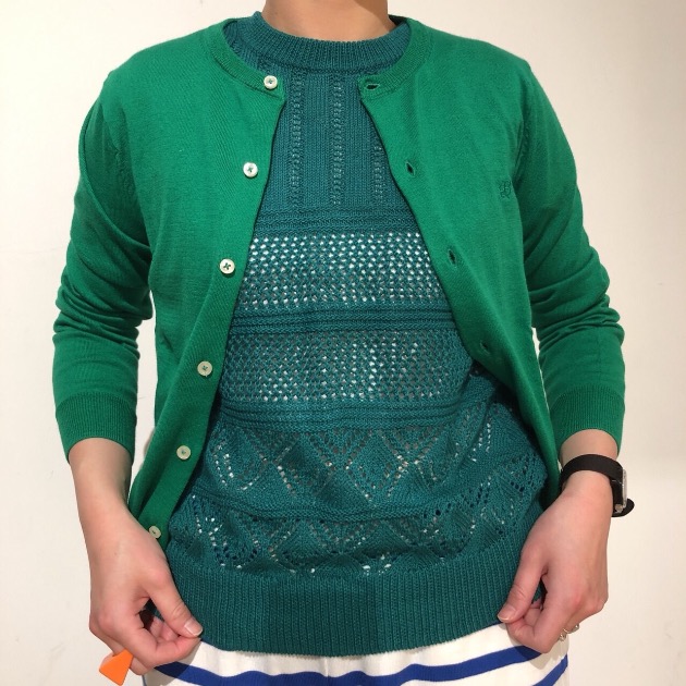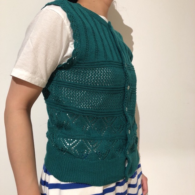 かぎ編みのベストからはインナーが透けるので、グリーンが強く出過ぎません。
