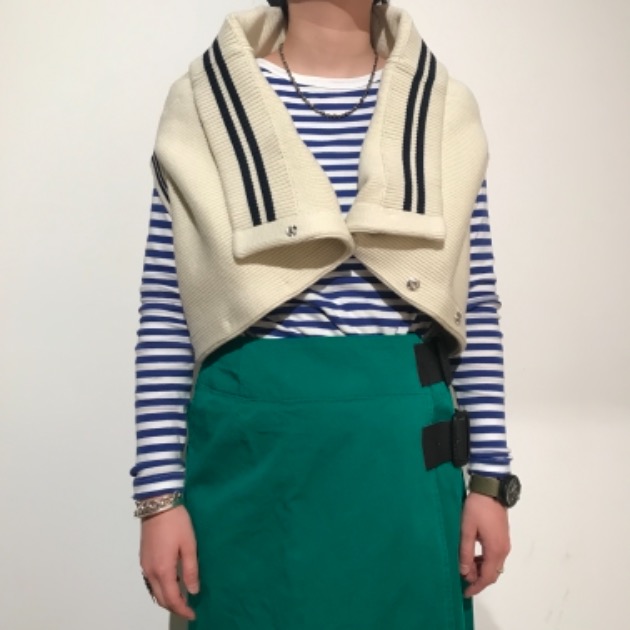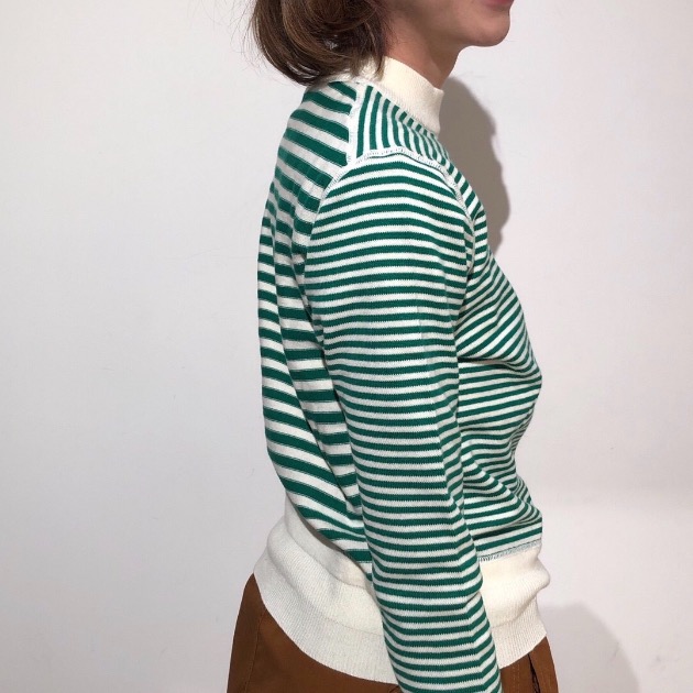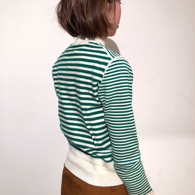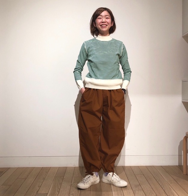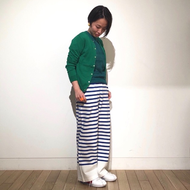 トップスのグリーンは鮮やかですがボーダーなので挑戦しやすい!
