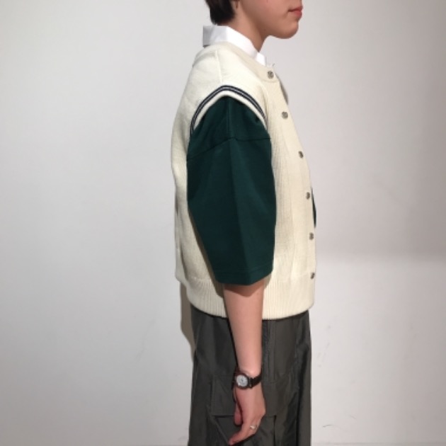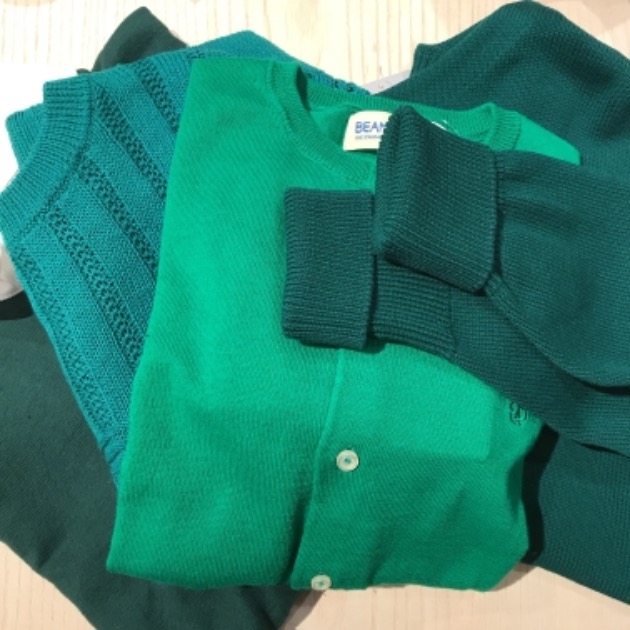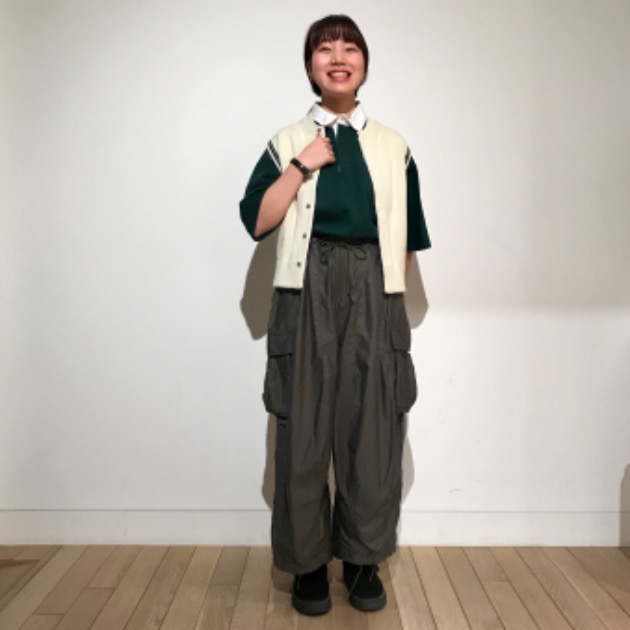 グリーンのトップスは、アメリカの老舗ブランド<COLUMBIA KNIT>のもの。