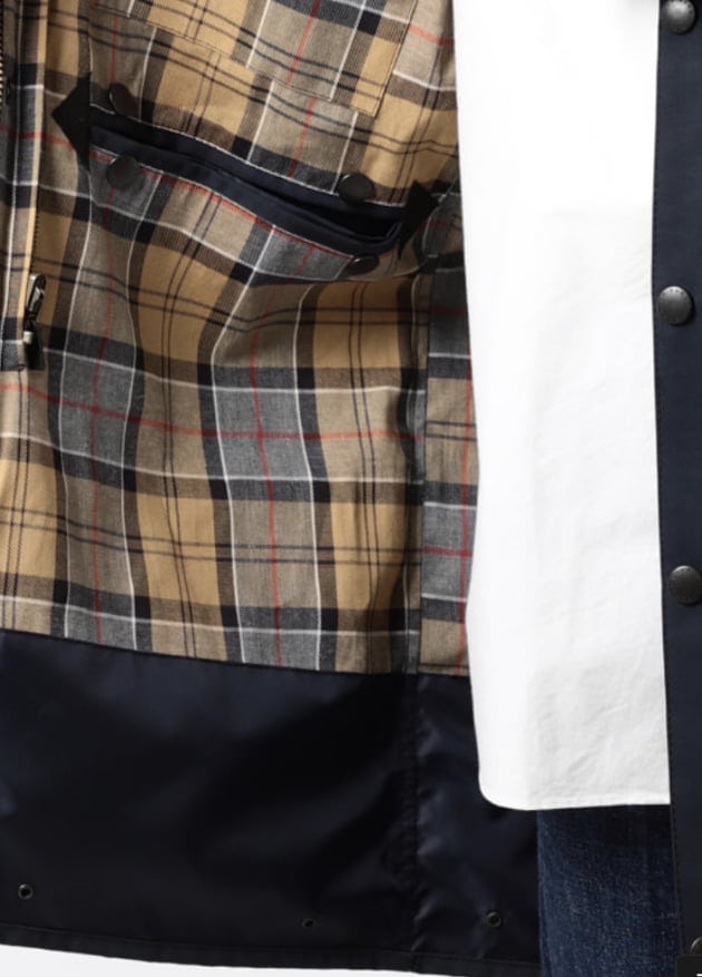 先程サラッとご説明した2レイヤーという生地は<Barbour>ではオイルドクロスと呼ばれるオイル、つまり油を染み込ませた生地を使用したモデルが昔から使われておりますが、2層の生地を合わせ使用することでオイルドクロスと同様の機能を持ちつつ、オイル独特のニオイやベタつきを解消した生地となっております。