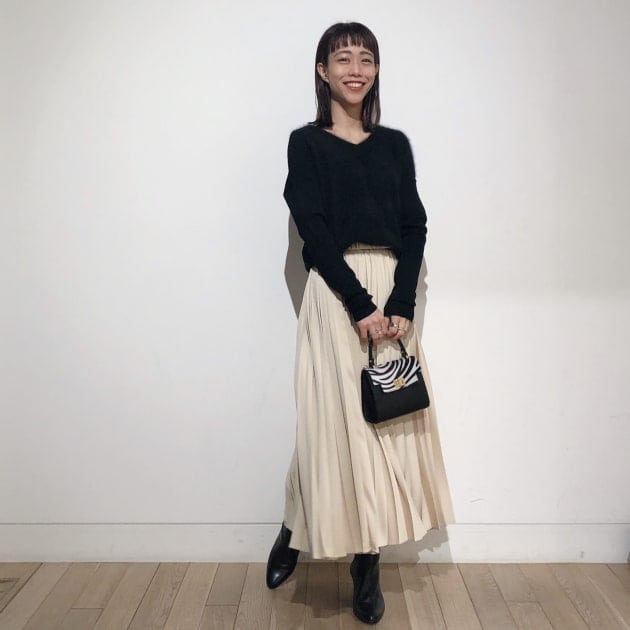 キレイめなプリーツスカートと合わせてオフィスカジュアルに。