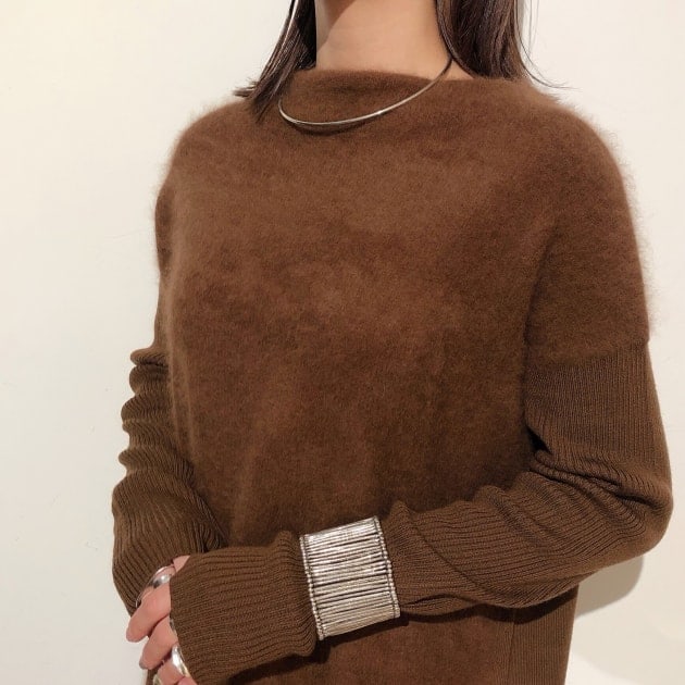・フロント、バック、袖の3パーツで素材や編み方が異なるので、表情の変わる仕上がり。