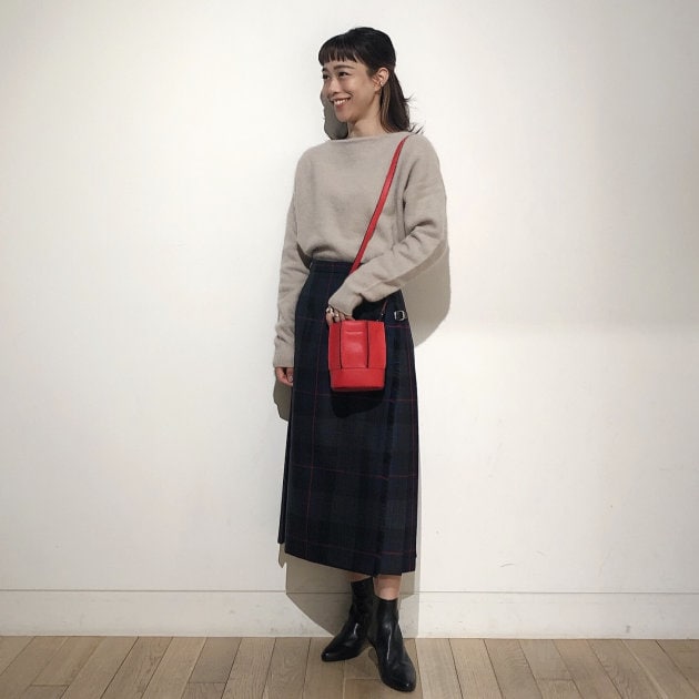 秋冬らしくチェックスカートと合わせてお出掛けスタイルに。