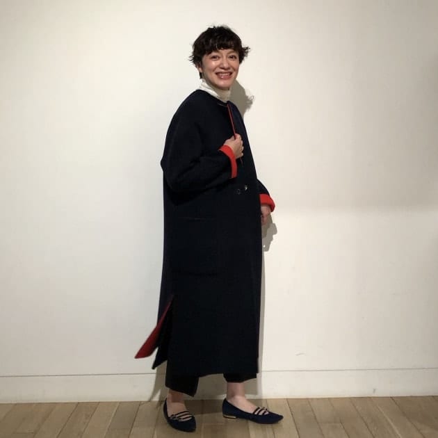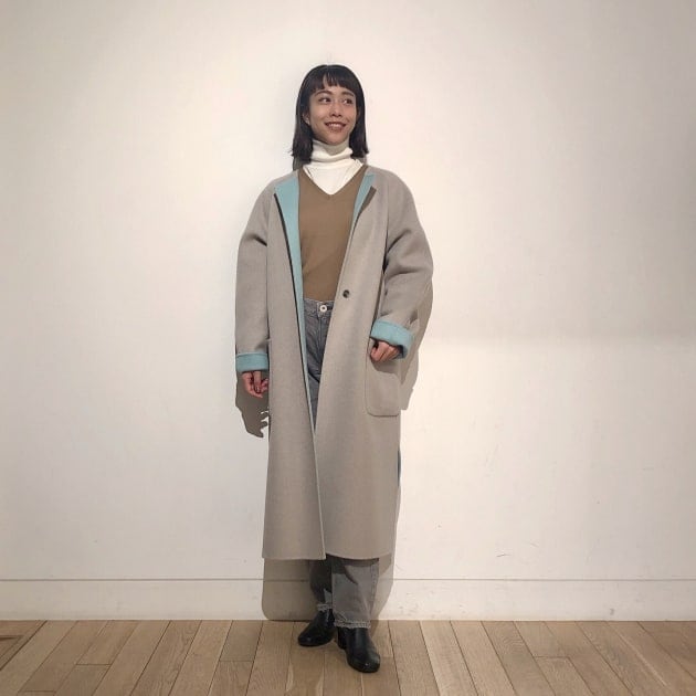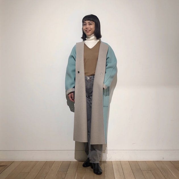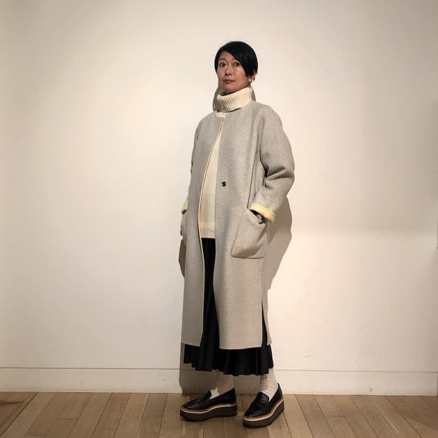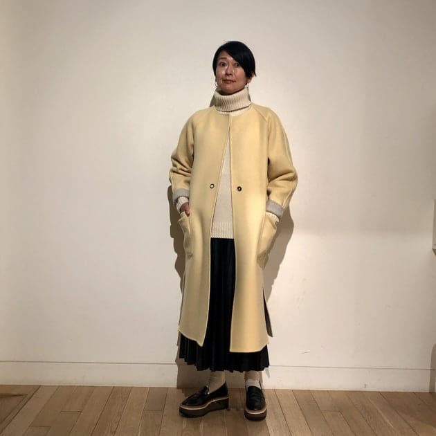 今シーズントレンドカラーのクリームイエローが優しい雰囲気で真冬の黒に偏りがちなスタイリングに華を添えてくれます。