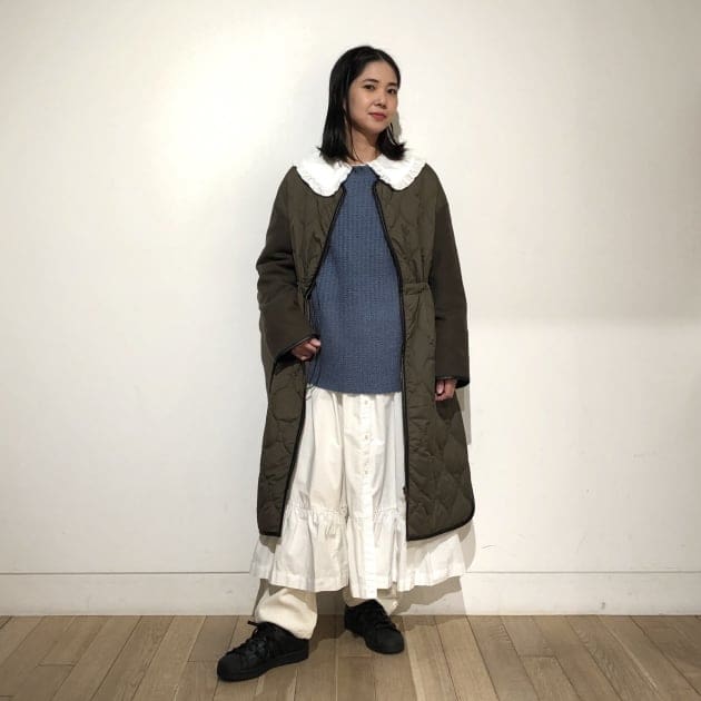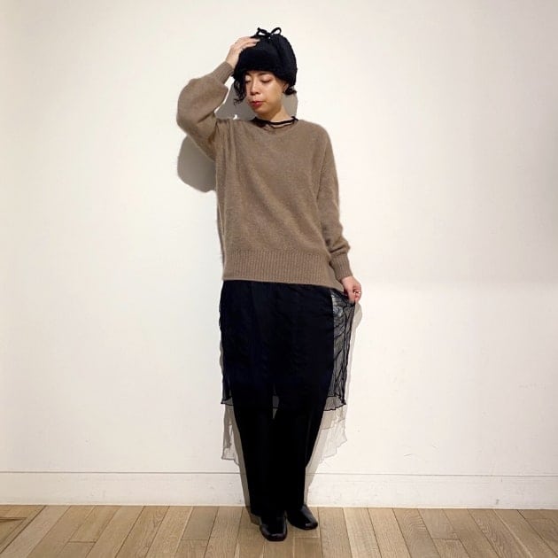 Vネックデザインなのでほっこりしすぎず、綺麗めにも合わせて頂けます!