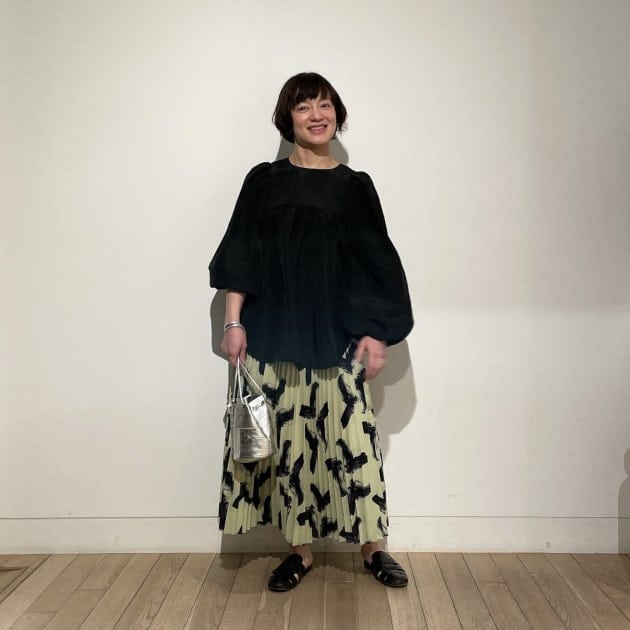 ホワイト×ブラックのベーシック合わせ。だからこそスカートの柄が活きますね!
