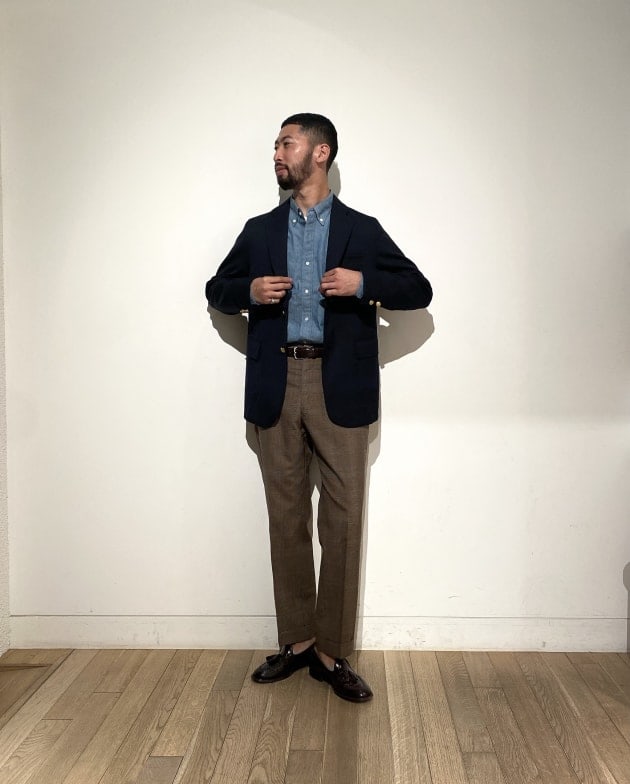 今回私はシャンブレーのボタンダウンと合わせノータイでカジュアルなスタイリング。こうしたカジュアルな装いにもしっかりハマってくれるのがやはりネイビーブレザーの汎用性が高いと言われる所以なのかと思います。