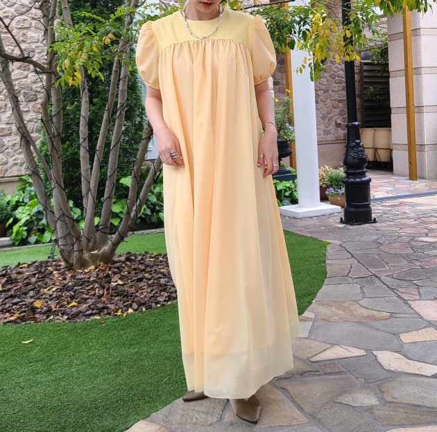 ギャザーたっぷり!オレンジイエローでとても可愛い1着です。