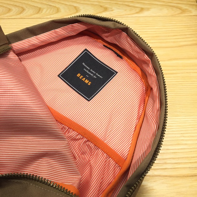 <Herschel(ハーシェル)>といえばバッグを開けた時に覗く赤と白のストライプが印象的ですが、こちらは別注モデルということもあり、中のストライプはオレンジのビームスカラーになっています!
