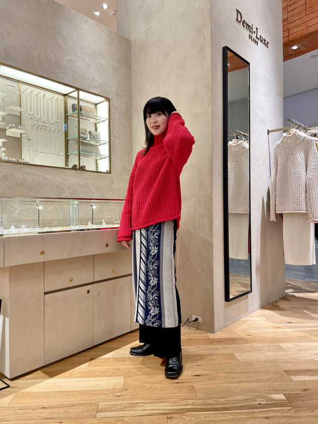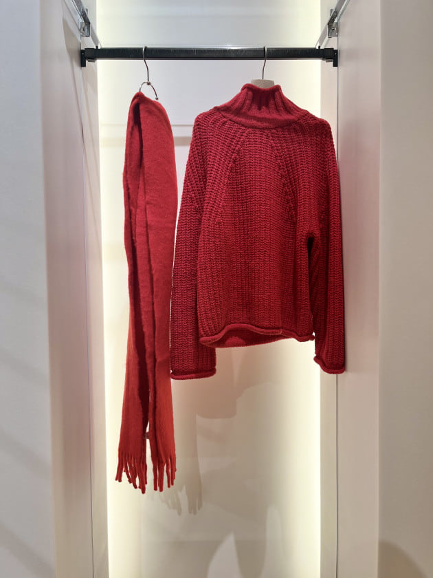 「私のあったかアイテム」。私からは《BATONERのニット》と、《Ray beamsのマフラー》。赤づくしでお届けしました!