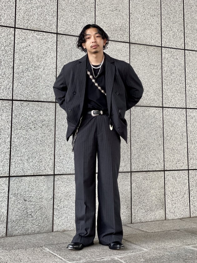 ダブルでルーズなサイズ感のジャケットにフレアの効いたスラックス。