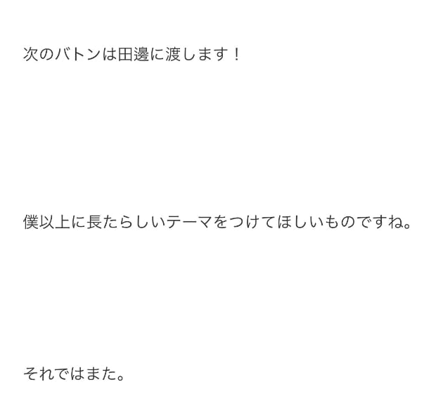 という事で、昨日の河村より回ってきたバトンをしっかりと受け継ぎ、タラタラと書いていきたいと思います。
