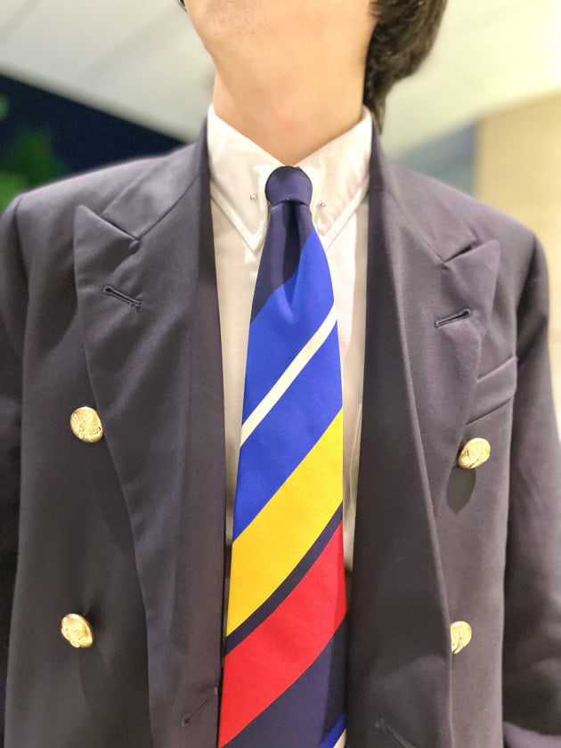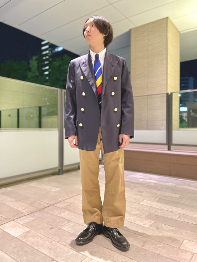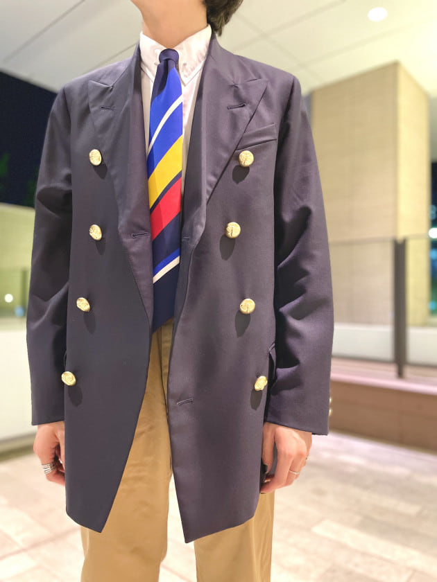 本当はアメカジスタイルが軸なのでレップストライプがイメージ通りなのですが、アイコニックにスタイリングのメインとして使えるデザインというのと、敢えてタイだけ浮かせて目を惹かせるという狙いでコチラを採用。