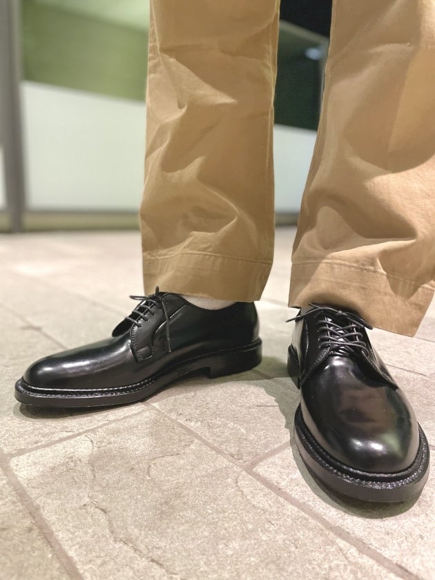 敢えてクラシカルにプレーントゥを採用。他のアイテムが、シンプルとはいえ遊びが効いている物が多いので、足元はドッシリと構えました。