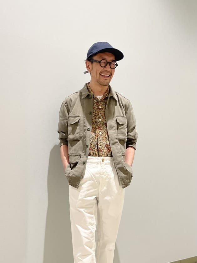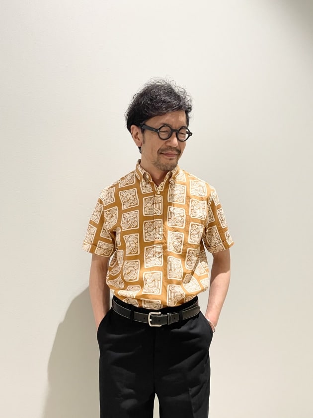 アロハと聞くとポップな色柄を連想しますが、こちらは落ち着いた配色。タックインしたTシャツの上にさらりと羽織ると、男度が上がる感じがします。
