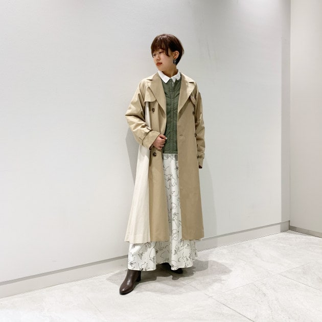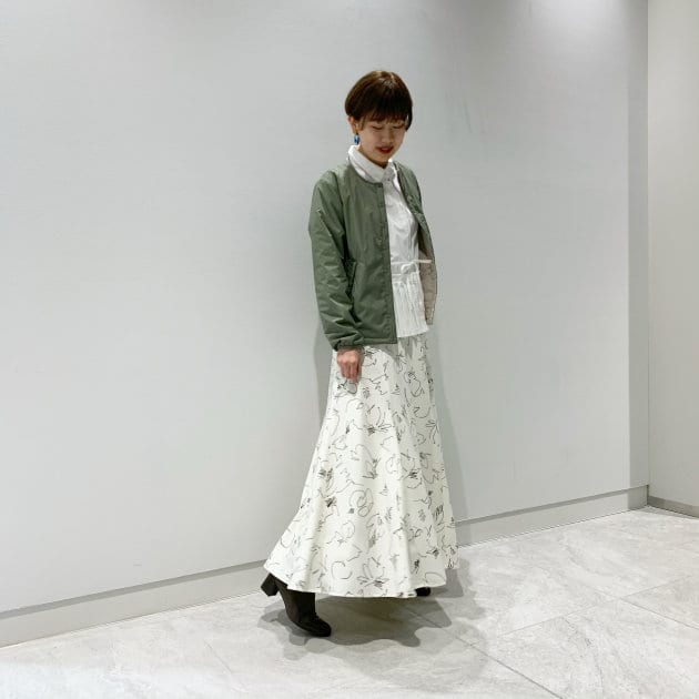 着丈がコンパクトなので、スカートやワンピースとも相性抜群!今回は女性らしいコーディネートでまとめてみました。