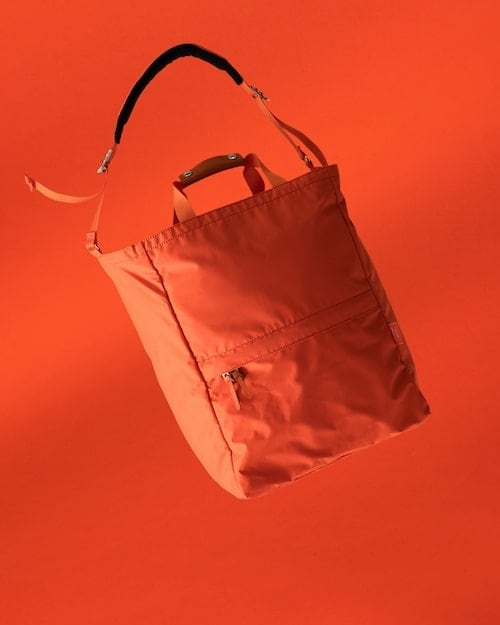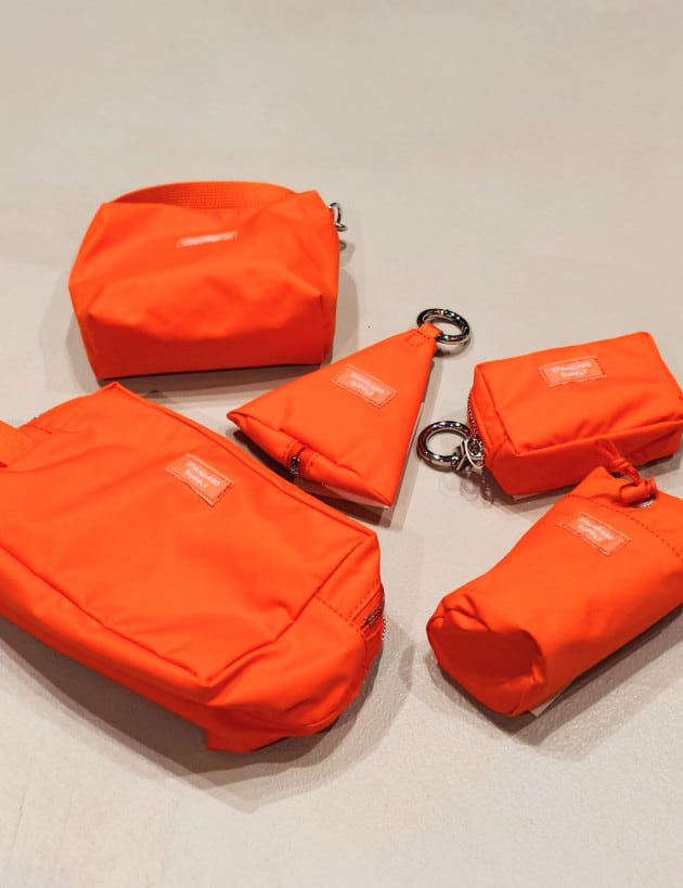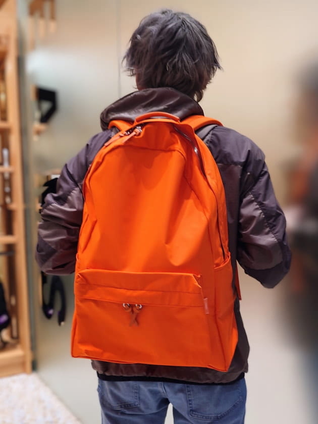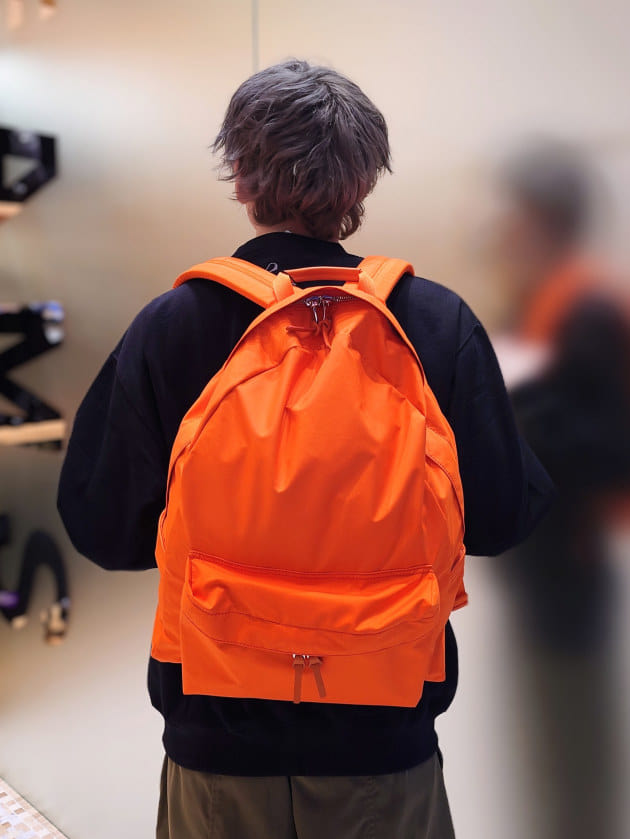 メインの生地はもちろん、付属のレザーパーツやテープの細部に至るまで、全てをビームスのコーポレートカラーであるオレンジで統一。