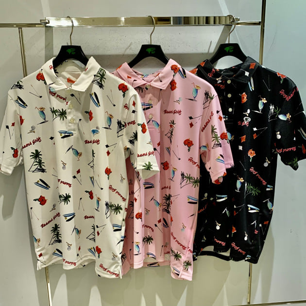イラストレーターのサトウカオル氏に書き起こしていただいた、カルフォルニアをイメージしたオリジナルゴルフ総柄ポロです☺︎