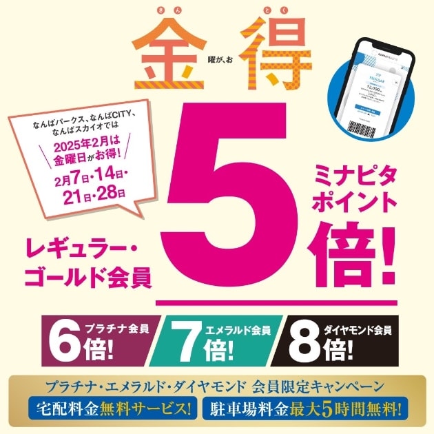 期間中、なんばCITY・なんばパークス・なんばスカイオでのご利用110円(税込)のところ、5ポイントにアップ!