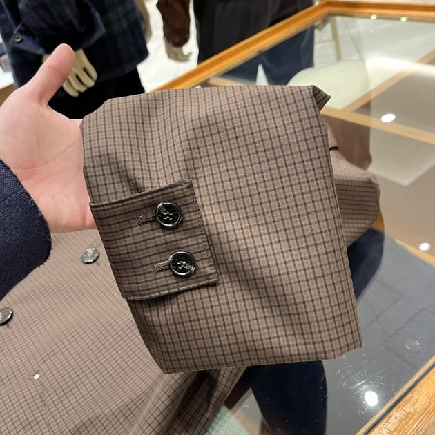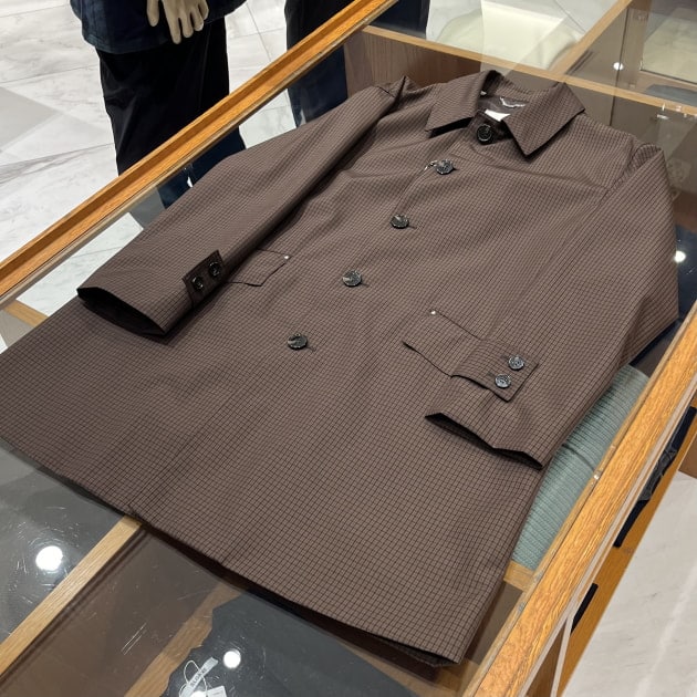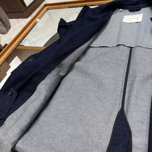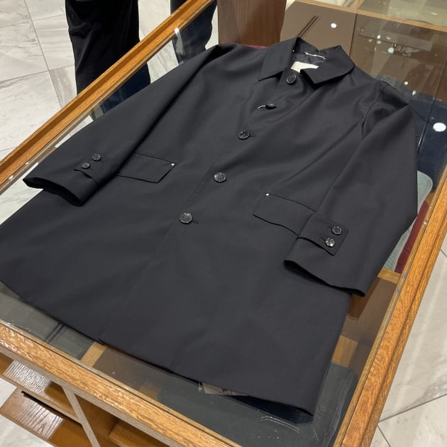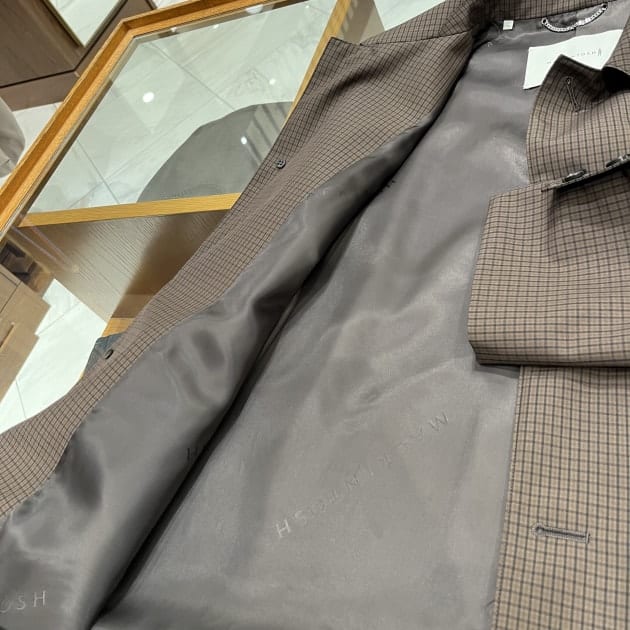 先程のブラウンチェックと同じような、さらっとしたウールの生地となっており、スーツの上に羽織っても様になる1着です。