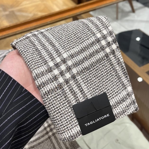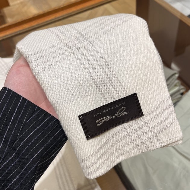 グレーのトーンオントーンで構成されたグレンチェック柄の方は、麻と系の混合素材で滑らかさと少しドライなタッチが魅力の生地になっています。