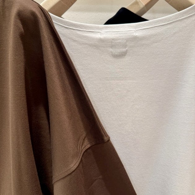 落ち感がある素材なので、ボリュームやオーバーが過ぎないドロップショルダーデザイン。