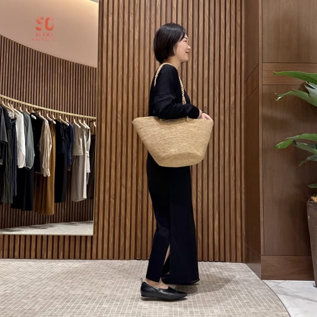 今回のブログでは、大きめラフィアバッグを合わせて、ブラックの重さを軽やかに。ナチュラルさも加わって抜け感あるカジュアルスタイルにしたり、