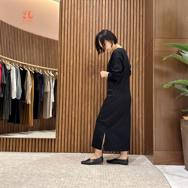 裾はマキシ丈に近い、しっかりとした長さ。スリットから覗く脚のラインも美しく見えます。