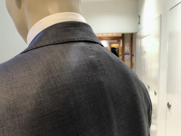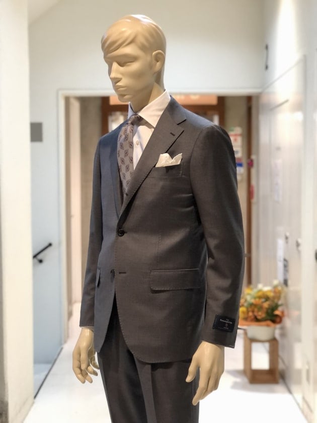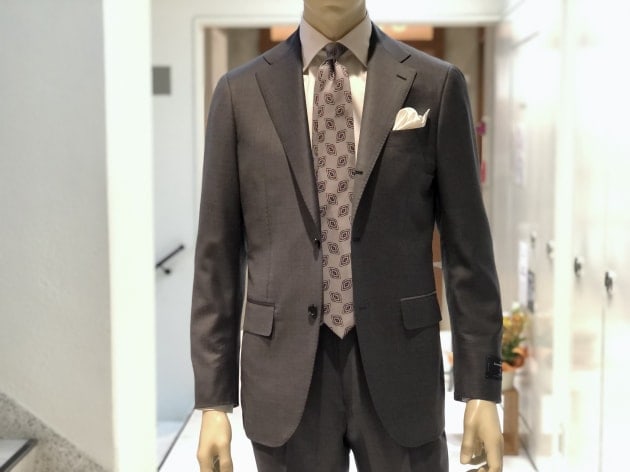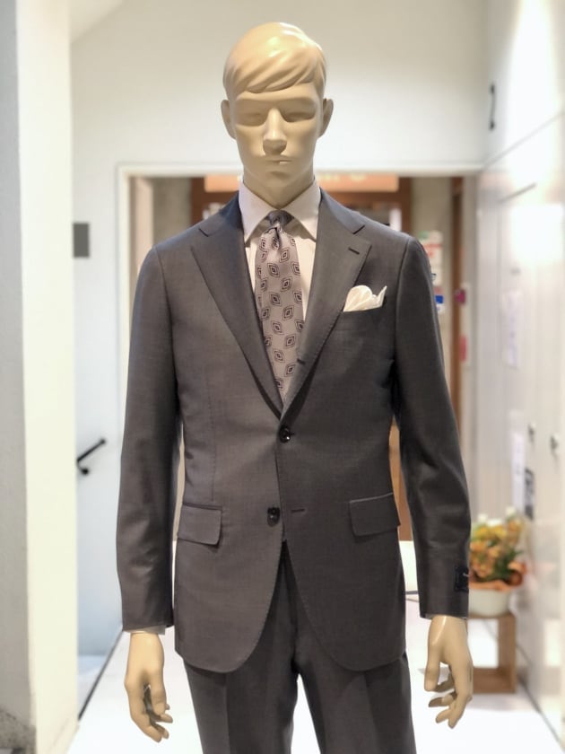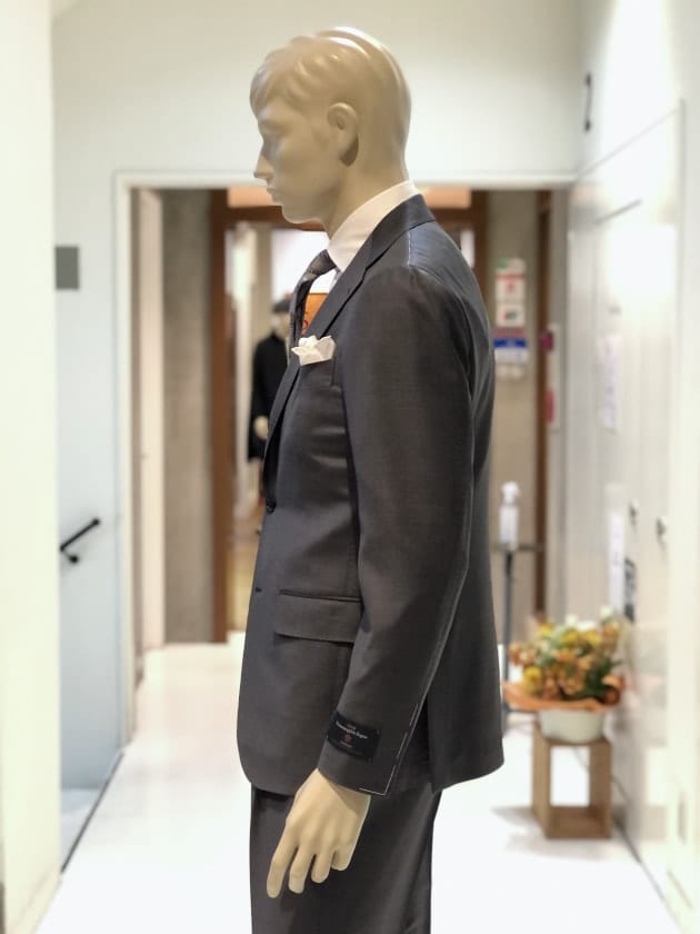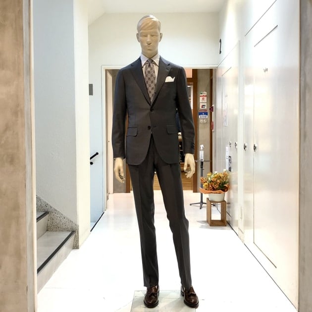 〈Brilla per il gusto(ブリッラ ペル イル グスト)〉のソリッドスーツです。左右で身頃の色が違う写り方になってしまいましたが、それだけ光の影響を受けやすいほど滑らか、という事にして下さい。