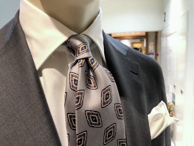 もう少し色の強いネクタイも主張があって良いのですが、スーツとのトーンオントーンで控えに控えたグレイベースの小紋柄は、割と周りに見当たらない個性があります。