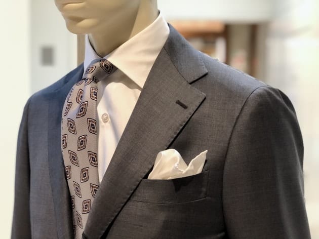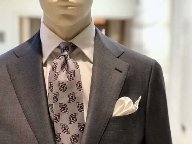 続々と入荷する新作のネクタイが、これまたよく合う合う。悩んだ末に、エグゼクティブな方を私なりに想像しました。〈FRANCO BASSI(フランコバッシ)〉の小紋柄プリントネクタイです。スーツもシャツもネクタイも、全て生地がサラッとしているところがポイント。