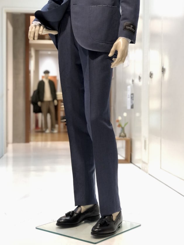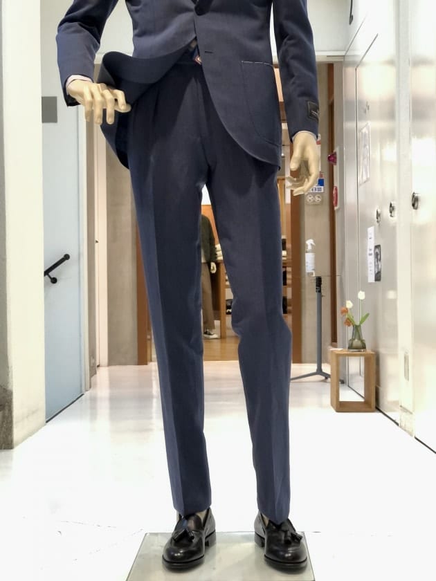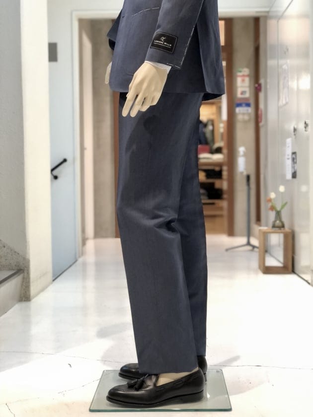 ウール52%リネン48%のヴィンテージを思わせるブルーグレイカラー。嗜好性の強い色と生地故に、ビジネスシーンに万能とは言えませんが、ファッションという視点では、とても洒落たスーツです。