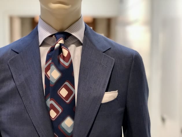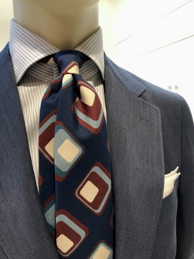 〈FRANCO BASSI(フランコバッシ)〉のダイヤモンド柄プリントネクタイは、シルク100%の品の良さに加え、大胆な柄と配色を駆使したレトロな佇まい。ブランドらしさが出ている1本です。