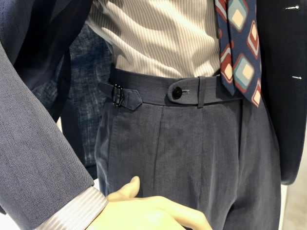 パンツのディテールにも顕著に表れています。サイドアジャスター採用のベルトレスパンツは、サルトリアディテールとして時にクラシックに、時にスポーティーにも映る最もわかりやすいポイントです。