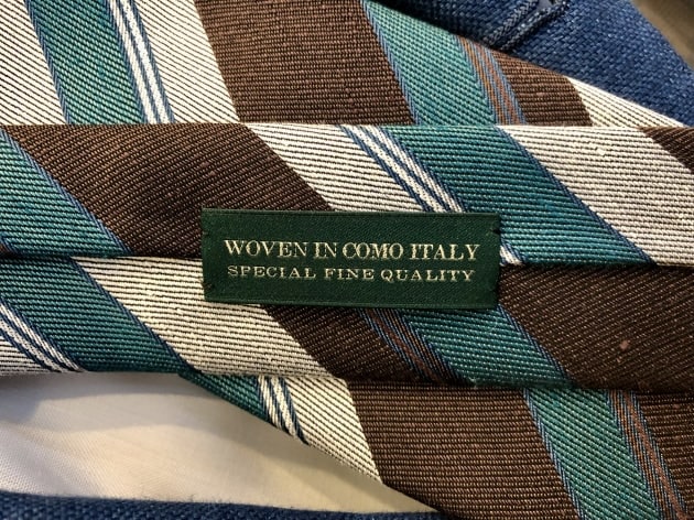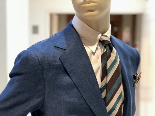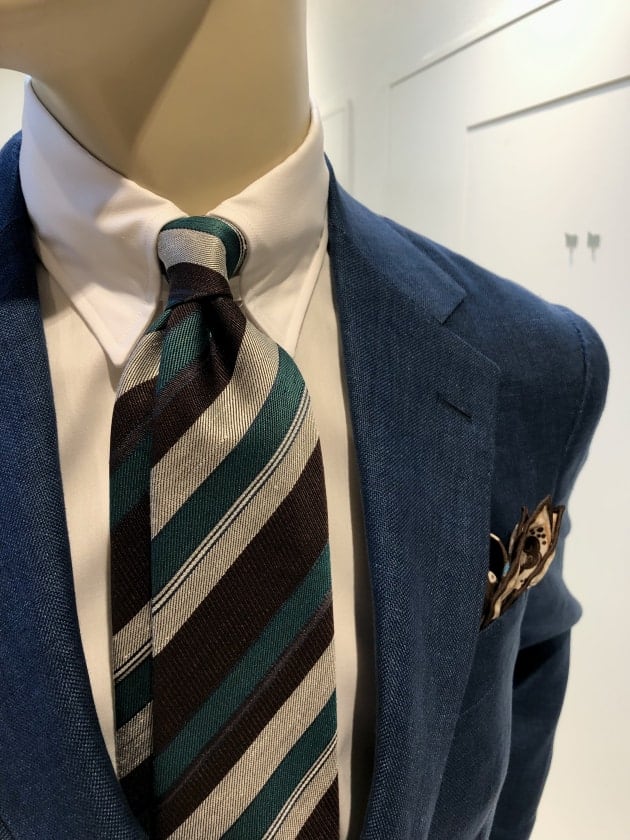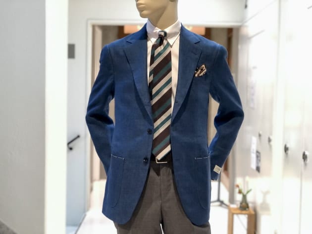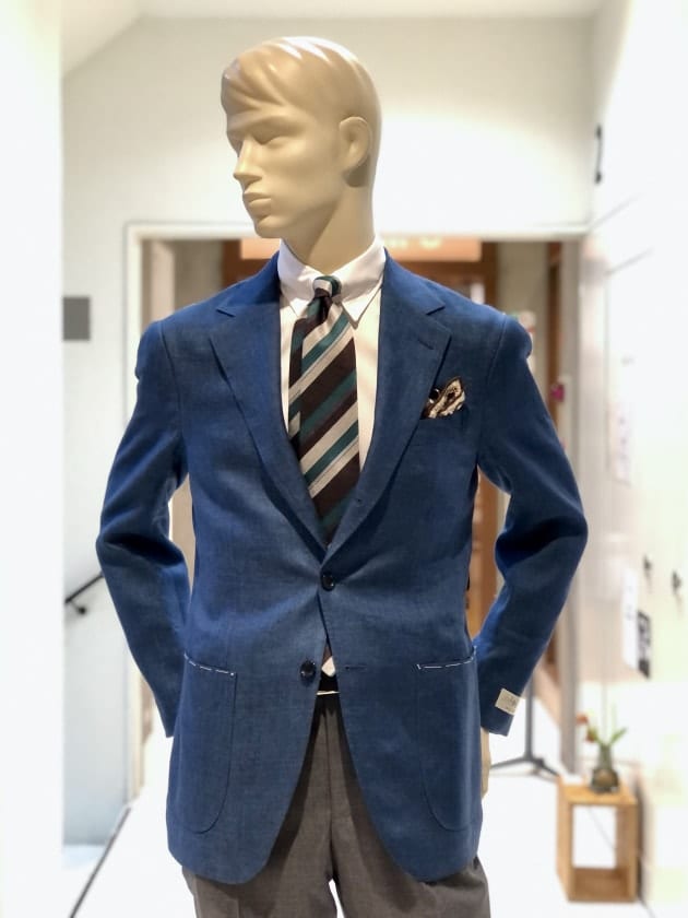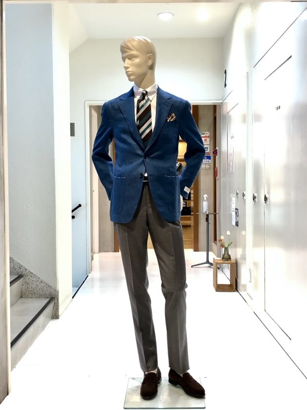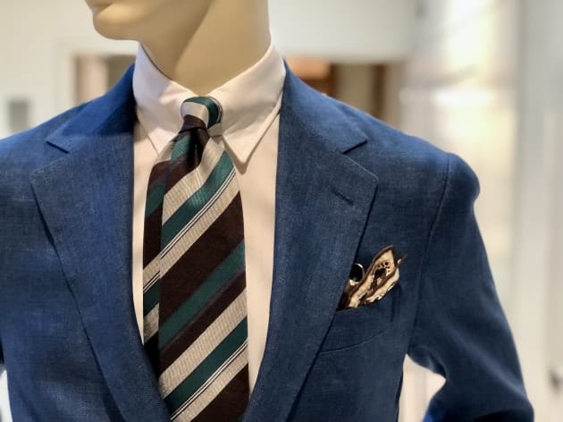 今回のような発色の綺麗なブルーのジャケットに、グリーンの入ったネクタイをあまり合わせたくないのが私の意見。ただ、単純にブルーを拾ったネクタイも芸がない。迷子になっていたそんな時、ダンボールを開けた瞬間に奇跡が起きました。「えっ?これグリーン?」などとボソボソ独り言を言いながら、そのブルーのようなグリーンのようなカラーリングに魅了されてしまいました。