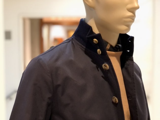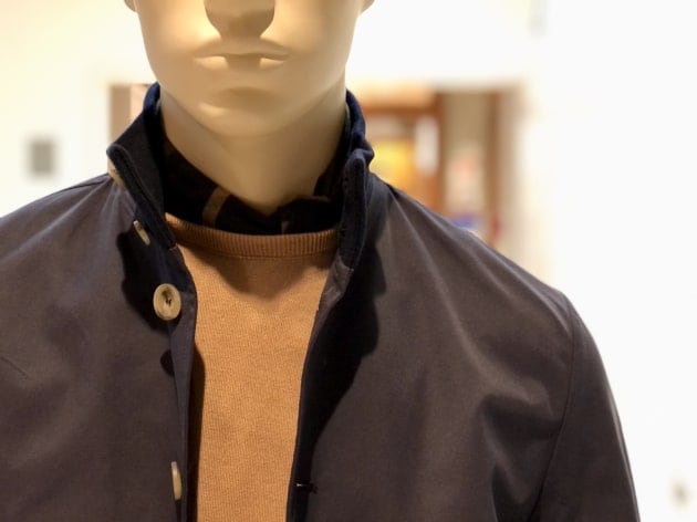 暗くてよくわかりませんが、ブラックベースのネッカチーフを巻いています。巻かなくても良いのですが、ブラックのシューズを履いているので、色の調整役です。オシャレという理由以外に、アウターやジャケットの襟を汚さない、という理由がある事はよく書かれていますが、最近、お客様に「首のシワを隠せるから重宝している。」と言われました。さすがに私の口からセールストークとしては使えませんが、そのような効果もあるみたいですよ。