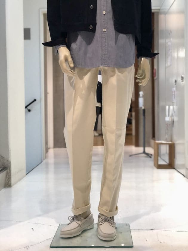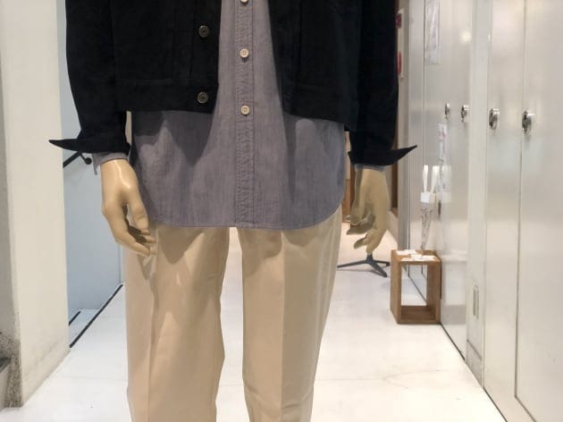 上品なワークウェアを組み合わせた究極の労働着スタイルです。〈AUBERGE(オーベルジュ)〉のシャンブレーワークシャツの詳しい情報は、他のスタッフブログをご覧いただくとして、上質かつ優雅なシルエットの他とは一線を画すシャンブレーシャツは、インナーとしてもレイヤードが楽しめる長い着丈が特徴です。