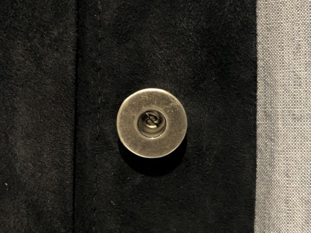 物資統制により、やむを得ず廉価版となる既製ボタンを使用した第二次大戦中期以降の“1st”。現代では皮肉にも“大戦モデル”として人気を博し、月桂樹や無地のドーナツボタンはスペシャリティとなりました。1950年代の好景気に生まれた“2nd”にドーナツボタンは使用されませんでしたが、デニムウェアとドーナツボタンは濃密な関係性を保ち、濃紺のデニムを彷彿とする今回のスエードにも好相性が窺えます。