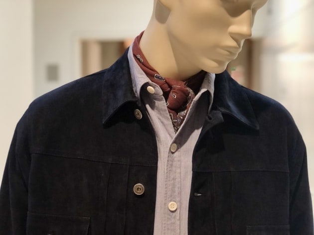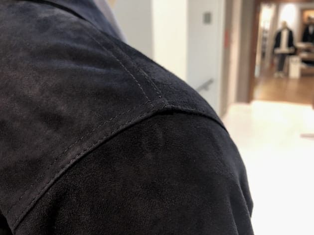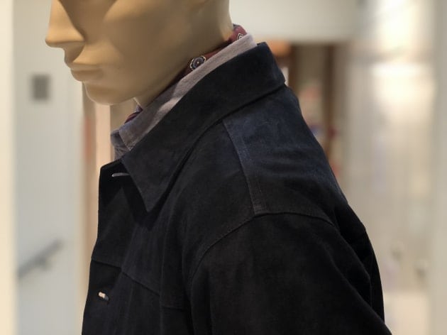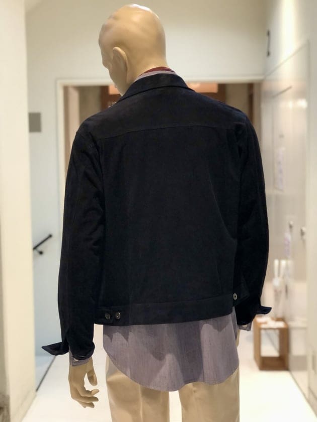 肩幅同様に身幅にも適度なゆとりがありますが、ヴィンテージのデニムジャケットに見られる袖のモッタリ感は良し悪し。大人の着る、ましてや上質のスエードともなれば、このくらいのスッキリ具合いは嬉しいポイントです。