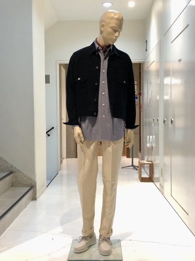 今回のブルゾンのメリットの1つに、デニムシャツまたはジーンズを合わせる事ができる点が挙げられます。とか言って合わせていないのですが、適度にゆとりのあるコットンチノやジーンズ、 ウールパンツも許容するスエードブルゾン。お勧めです。