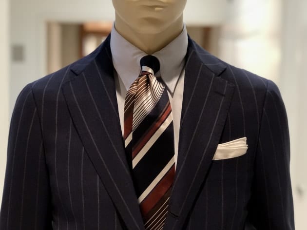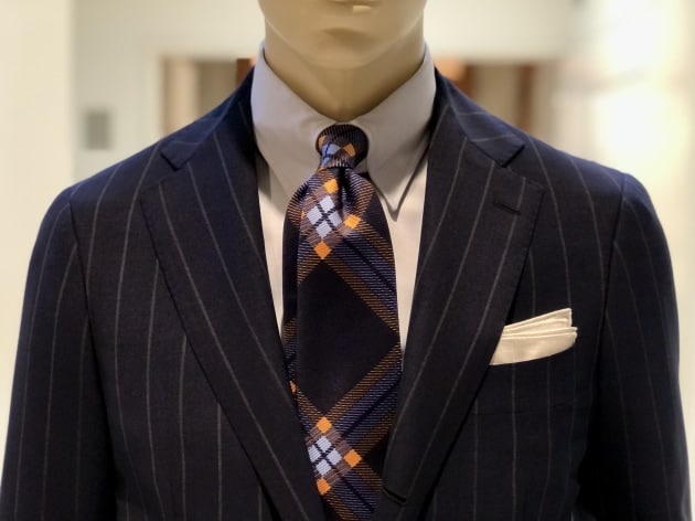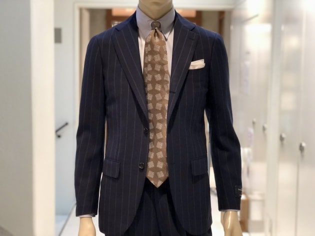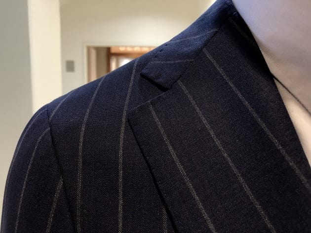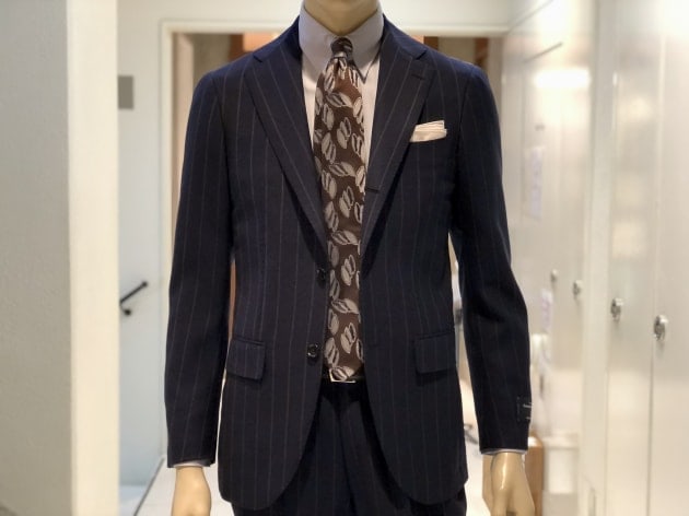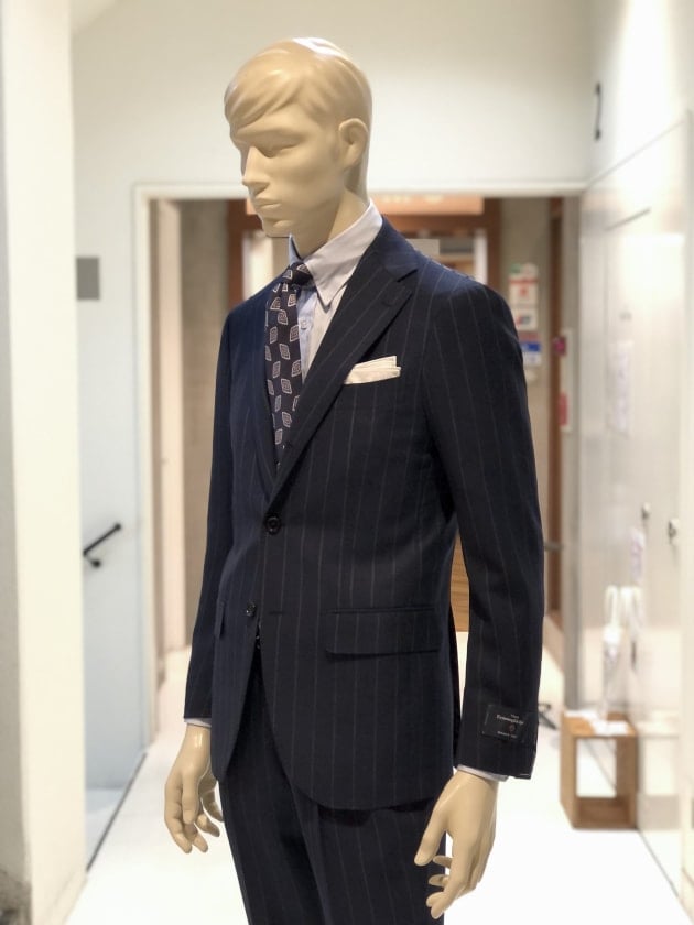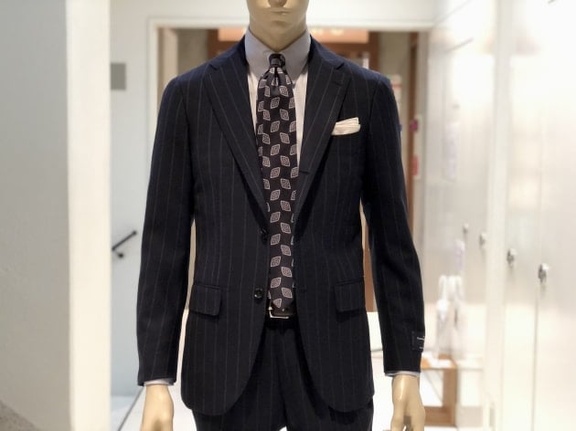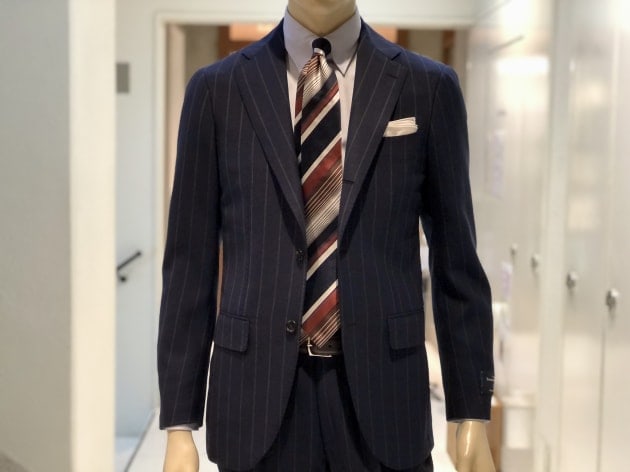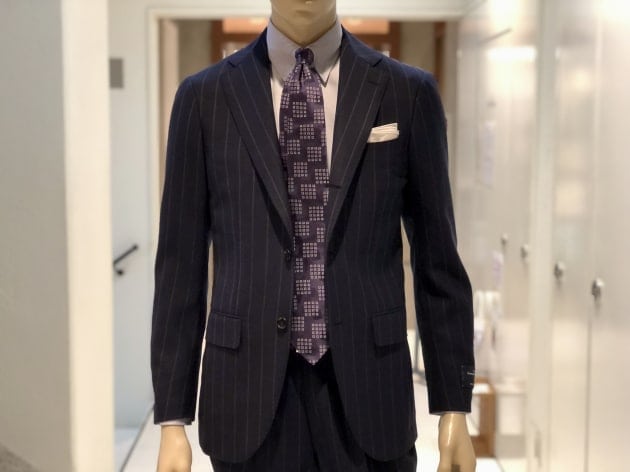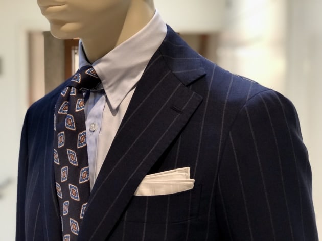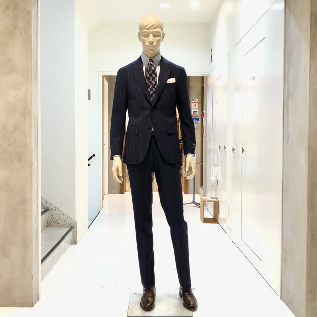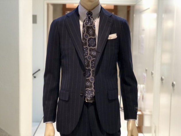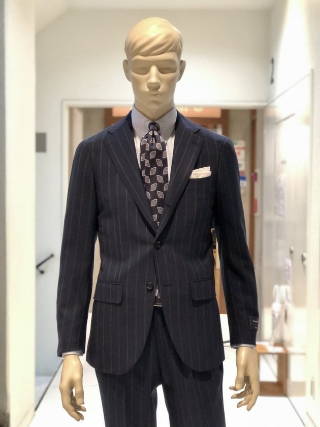 浅いネイビーに2.5㎝ピッチのシルバーのチョークストライプは、ツウも好む細すぎず太すぎずの良い塩梅。