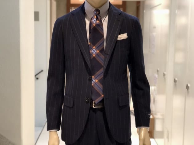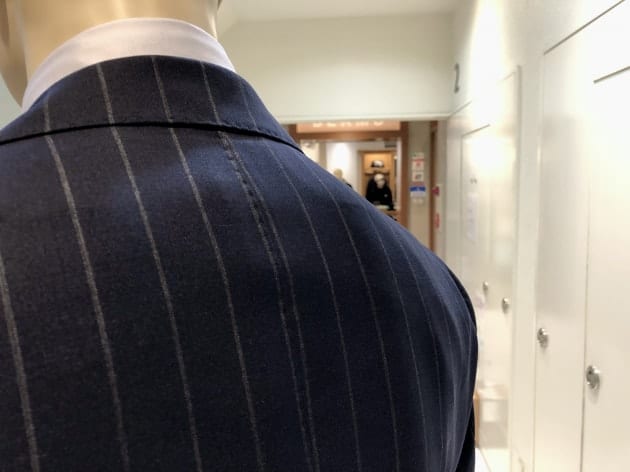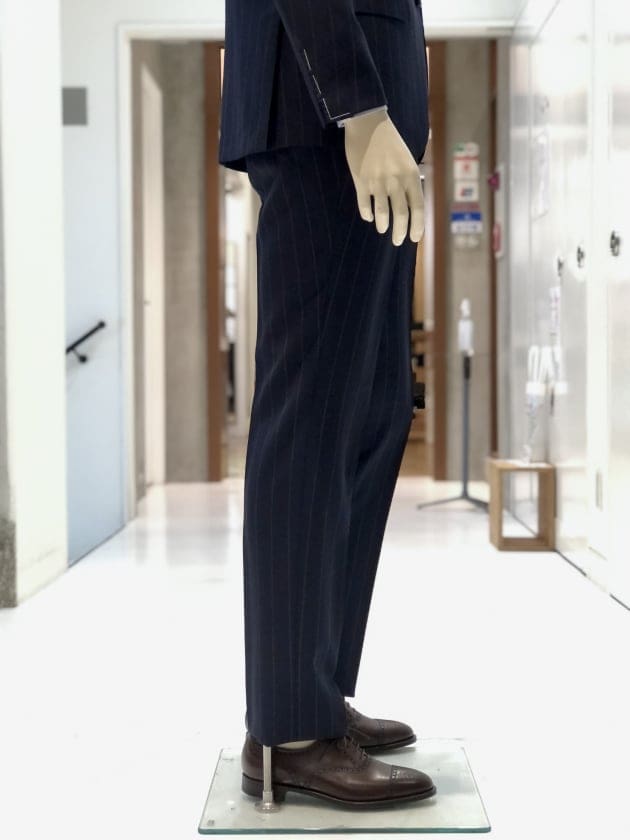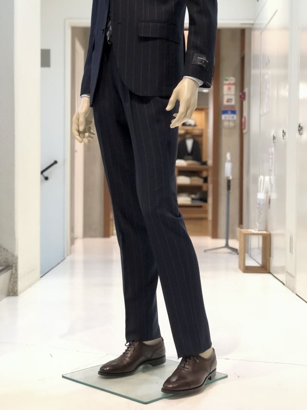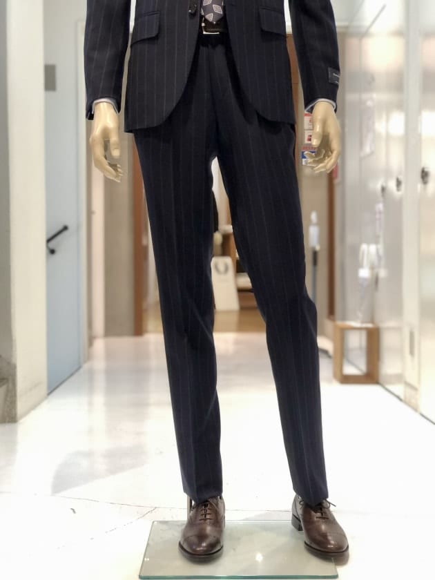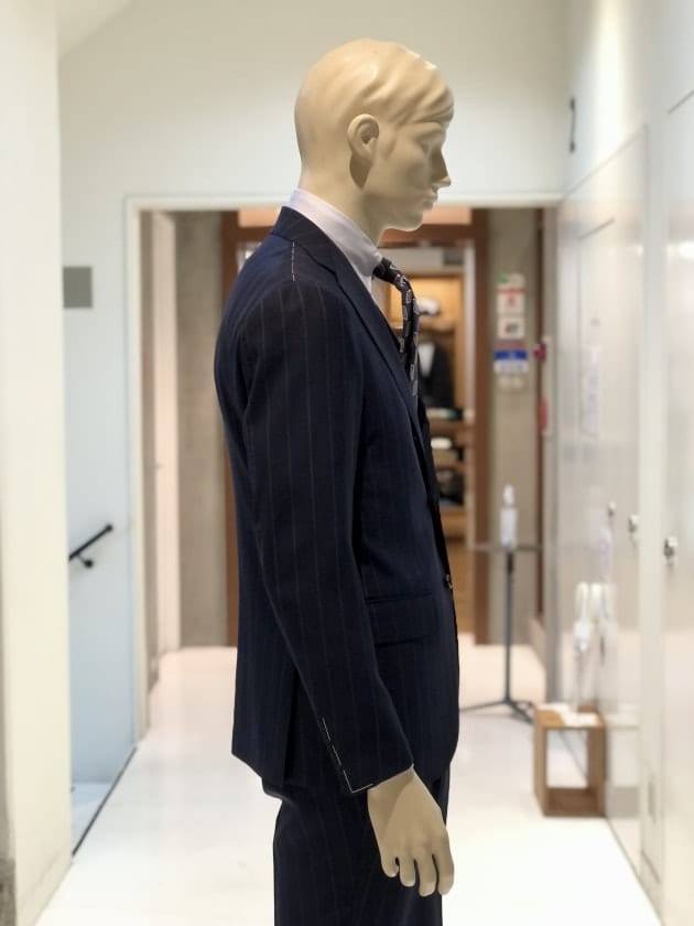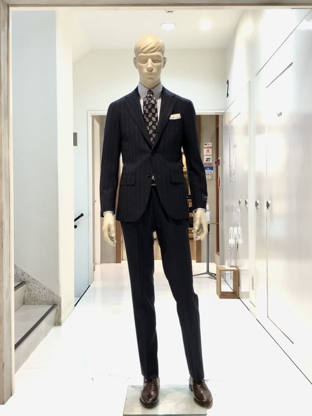 今回のチョークストライプはネイビーとの馴染みも良く、私基準ですが、セミワイドピッチといったところ。決して威圧感のあるものではないので、あらゆるビジネスシーンに対応可能な、ストライプスーツの定番に加えていただきたい一着です。