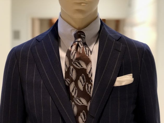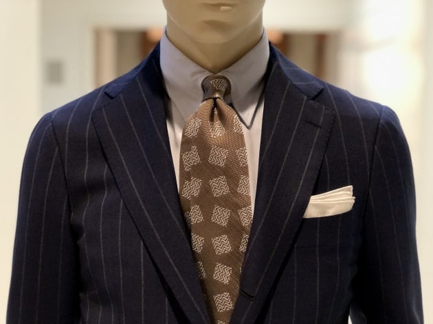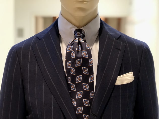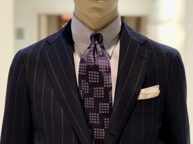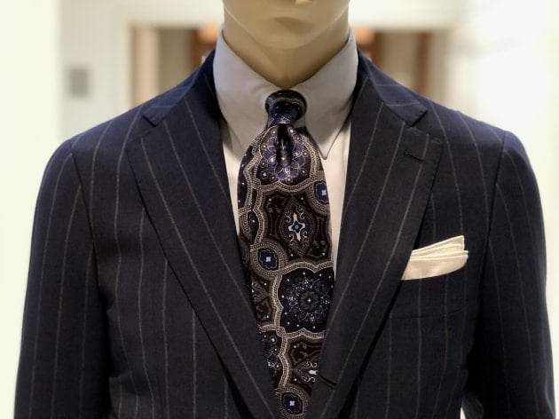 幅広いコーディネートが期待できる今回のスーツ。店頭を彩る様々な小紋柄のネクタイをほぼ網羅します。