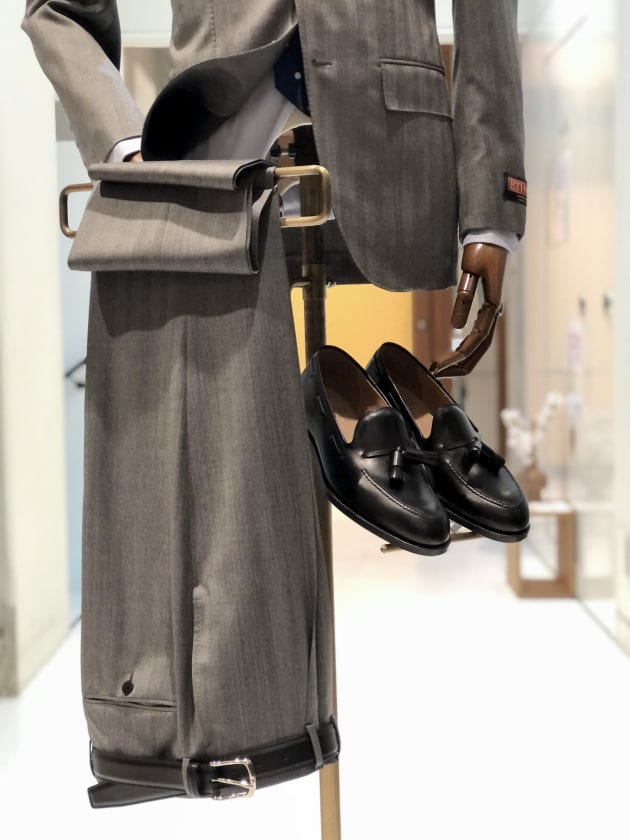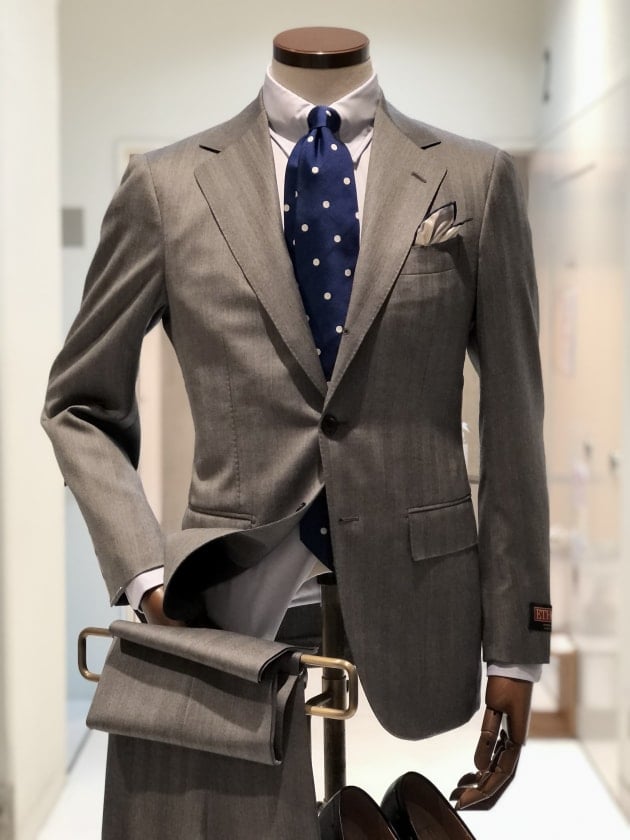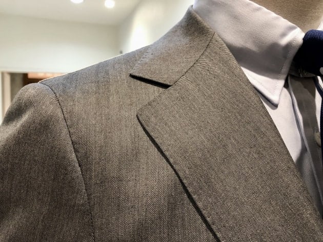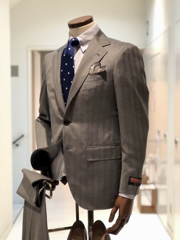 理由は、E.THOMAS(イー・トーマス)社のSuper130’Sウール。細い繊維が生み出す適度な光沢とヘリンボーンの陰影が美しく、無地のようで無地ではない、控えめの高感度が窺えます。