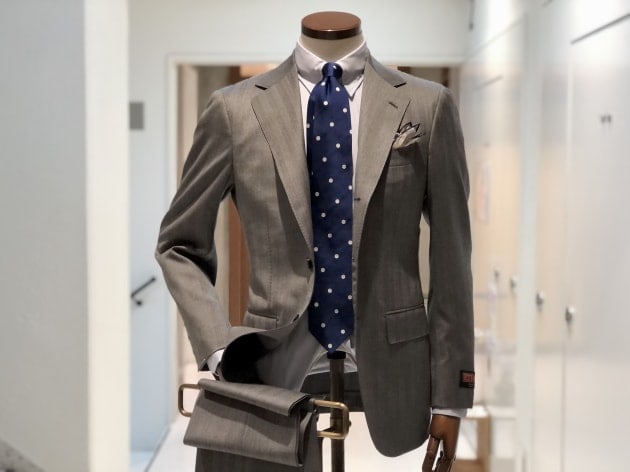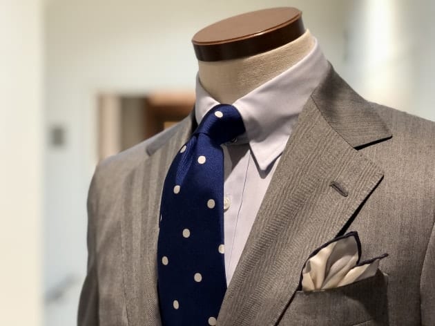 今回のスーツの場合、ネクタイの色が薄いと清涼感は出るもののボヤけてしまう…。反対に、色が濃いとスーツとの濃淡が強くて、せっかくの清涼感が台無しに。彩度と明度のバランスが求められる…。やはりツウのスーツかもしれません。