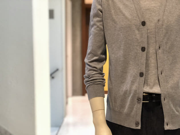 〈JOHN SMEDLEY(ジョン スメドレー)〉の別注30ゲージコットンカーディガンと、同じく別注30ゲージコットンクルーネックニットです。