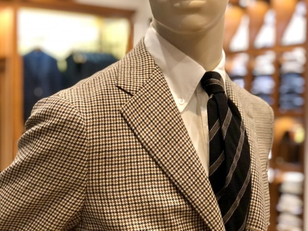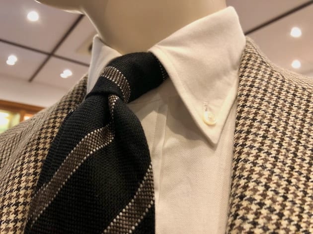 シルクのネクタイでもそれほど違和感は無いのですが、やはりウールのネクタイが秋冬のジャケットにマッチします。ブラック×ブラウンの配色はジャケットの色とのマッチング、ストライプのピッチがジャケットの柄とのメリハリを意識しています。